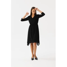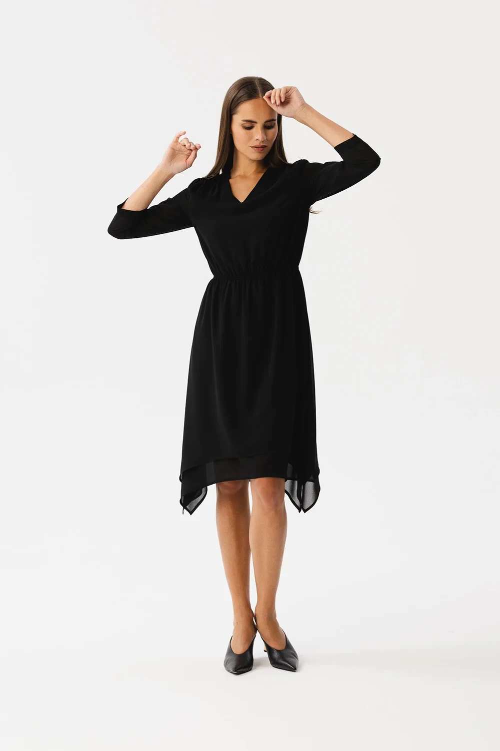 Zde jsou krásné šaty z jemného šifonu, který jim dodává lehkost a jemnost. Šaty mají asymetrický vrstvený lem, který jim dodává originalitu a lehkost. Výstřih ve tvaru písmene V je elegantní a klasický. Guma v pase zvýrazňuje pas a zároveň poskytuje pohodlí. Rukávy v délce 7/8 dodávají šatům moderní nádech. Délka šatů sahá nad kolena, což jim dává univerzálnost pro různé příležitosti. Částečně podšité pro větší pohodlí a správné zakončení. Šaty se skvěle hodí na všechny výlety, večírky nebo setkání s přáteli, kterým dodají na jemnosti a eleganci. Navrženo a ušito v Polsku.