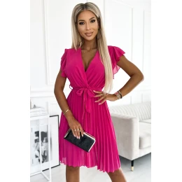 Šifonové plisované šaty se srdíčkovým výstřihem, volánky na ramenou a mašlí v pase. Šaty v barvě barbie pink. Značka numoco. Evropská výroba.