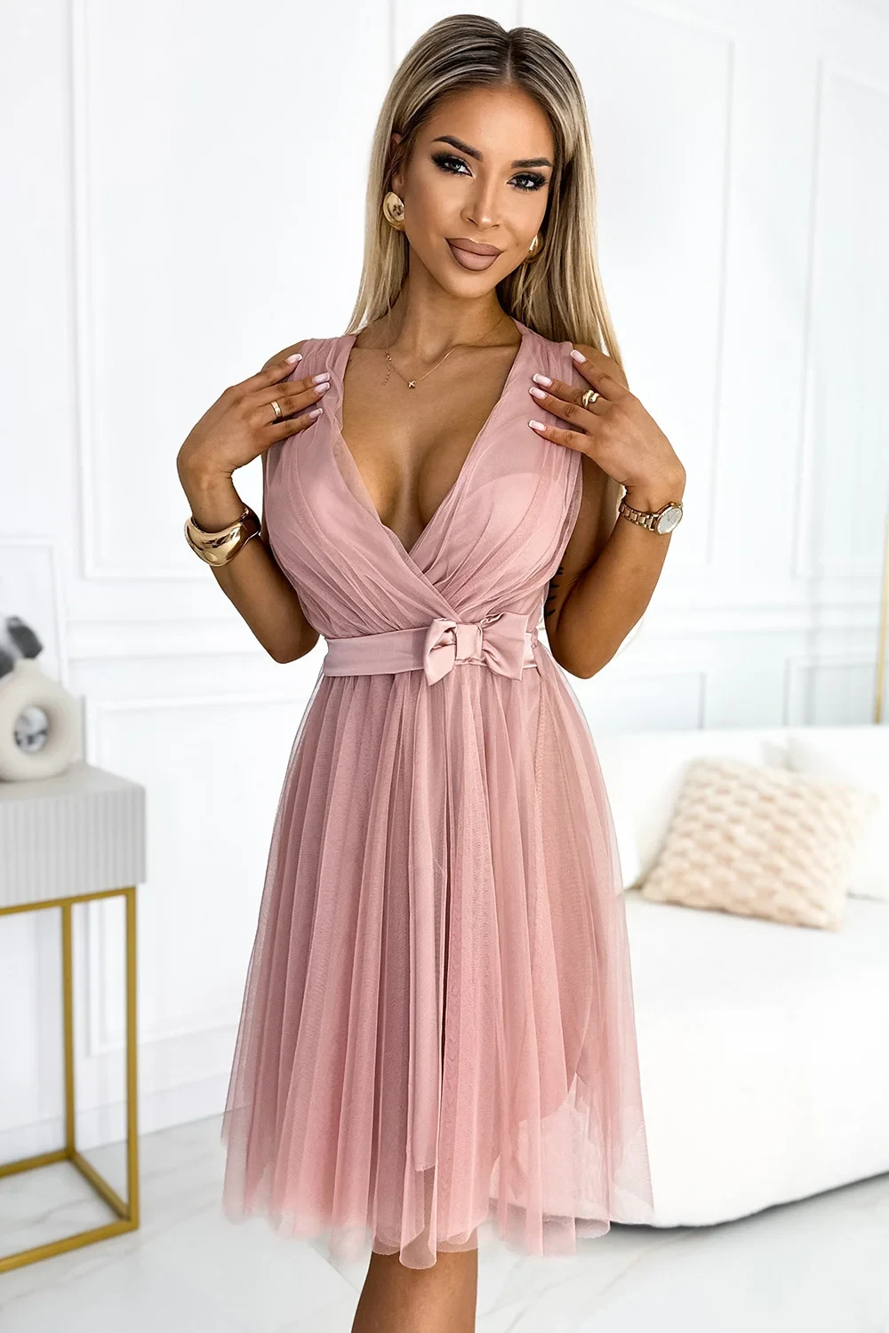 Ženské tylové šaty se srdíčkovým výstřihem a saténovou mašlí. Zadní díl šatů je ušitý z elastického elastonitu, takže padne většině velikostí. Šaty jsou v barvě špinavě růžové. Značka numoco basic. Evropský výrobek.