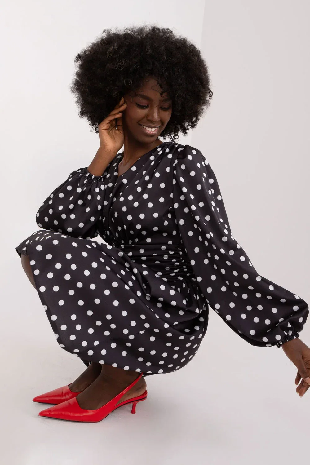 Koktejlové šaty jsou elegantní a šik, ideální pro zvláštní příležitosti. Jejich rozšířený střih jim dodává lehkost a žena, která je nosí, se v nich cítí nesmírně žensky. Tyto šaty jsou ideální volbou na večírky nebo slavnostní příležitosti. Vzor s dominantním hráškem dodává šatům jemný a klasický dojem. Šaty jsou vyrobeny z vysoce kvalitní bavlny a zaujmou nejen svým vzhledem, ale také pohodlím. Díky délce pod kolena jsou ideální volbou pro mnoho různých příležitostí. Srdíčkový výstřih zvýrazňuje krk a dodává šatům eleganci, zatímco skryté zapínání na zip umožňuje přesné přizpůsobení. Nafouklé dlouhé rukávy dodávají šatům lehkost a romantiku a zároveň jsou módním akcentem. Šaty jsou pohodlné díky podšívce, díky níž je jejich nošení ještě pohodlnější. Ozdobné řasení na ramenou a v pase dodává šatům jedinečnost a zvýrazňuje ženskou siluetu. Tyto koktejlové šaty jsou kombinací elegance, pohodlí a módní jemnosti, ideální pro večerní setkání nebo zvláštní příležitosti.