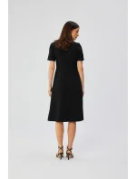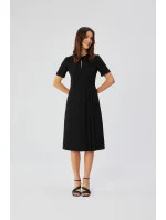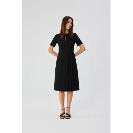 Šaty, které byly vytvořeny s důrazem na detail, jsou jedinečným kouskem oděvu navrženým a ušitým v Polsku, což podtrhuje vysokou kvalitu zpracování a místní charakter. Ozdobné záhyby na bocích šatů dodávají celkovému vzhledu jedinečný nádech a dodávají šatům osobitý a originální vzhled. Slzovitý výstřih dodává šatům jemnost a zvýrazňuje jemně odhalený hrudník. Přestřižení v pase vnáší do střihu eleganci a zdůrazňuje ženské křivky. Krátké ohrnuté rukávy dodávají šatům lehkost a působí ležérně. Spodní část ve tvaru písmene A zajišťuje šatům pohodlí a zároveň dodává jemný, decentní tvar ženské siluetě. Díky délce pod kolena jsou šaty vhodné jak pro formálnější příležitosti, tak pro každodenní nošení. Skrytý zip na zadní straně usnadňuje oblékání a svlékání šatů a zároveň zachovává jejich elegantní vzhled. Díky absenci podšívky látka příjemně sedí na těle a zůstává lehká a pohodlná na nošení. Tyto šaty se vyznačují nejen originálním designem, ale jsou také hrdým představitelem polského krejčovského a návrhářského řemesla.