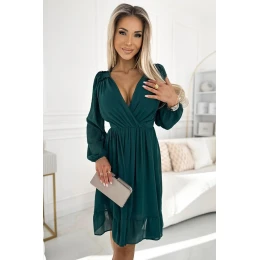Šifonové midi šaty s dlouhými rukávy a elegantně zakončeným výstřihem. Šaty jsou v lahvově zelené barvě. Celé šaty jsou pošité podšívkou. Značka numoco. Polská výroba.