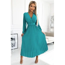 Plisované midi šaty s obálkovým výstřihem, dlouhými rukávy a širokým páskem. Jsou vyrobeny z krepové tkaniny v barvě moře. Ideální šaty pro každou příležitost. Značka numoco basic. Evropská výroba.