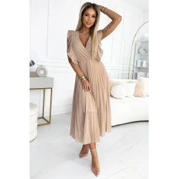 Sukně z elasické šifónové látky s výstřihem a volánky na ramenou. Sukně je ušitá v moderní délce 7/8. Na zádech se zapíná skrytým zipem. Sukně je v béžové barvě. Značka numoco. Vyrobeno v Polsku.
