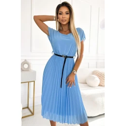 Plisované šaty s kulatým výstřihem, černým páskem a krátkým rukávem. Vyrobena ze sytě modrého šifonového materiálu s podšívkou. Ideální šaty na každou příležitost. Značka numoco basic. Vyrobeno v Evropě.