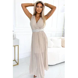 Plisované šifónové šaty s výstřihem a širokým páskem. Plisování na výstřihu a sukní přidává šatům eleganci. Šaty jsou béžové barvy a mají podšívku. Značka numoco basic.