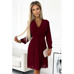 Plisované šifonové šaty s dlouhými rukávy a výstřihem. Šaty ve vínové barvě. Značka numoco. Polská výroba.