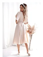 Elegantní šaty v odstínu modré jsou ideální volbou na speciální příležitosti. Vyrobené z vysoce kvalitního materiálu skvěle padnou na postavu, zdůrazňují její přednosti. Model má výstřih ve tvaru písmene V, který jemně zdůrazňuje krk a klíční kosti. Rukávy s volným, volánovým střihem dodávají šatům lehkost a romantický charakter. Pas je zdůrazněn ozdobným pásem s jemným zdobením, co krásně podtrhuje postavu. Rozkročený spodek dodává šatům lehkost a eleganci. Šaty se zapínají na skrytý zip, co zajišťuje pohodlí nošení a ideální přizpůsobení. Skvělé na svatby, oslavy, křty a další elegantní události.