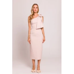 Elegantní midi šaty ve střihu tužkové sukně, zdůrazňující ženskou siluetu. Model ohromuje asymetrickým střihem s motivem na jedno rameno, ozdobeným efektní mašlí, která dodává eleganci a jedinečný charakter. Vysoký rozparek vzadu jemně odhaluje nohu, dodávající kreaci lehkost a smyslnost. Šaty se zapínají po stranách na skrytý zip, co zajišťuje ideální přizpůsobení. Částečná podšívka zaručuje pohodlí při nošení. Navrženo a ušito v Polsku s důrazem na každý detail.