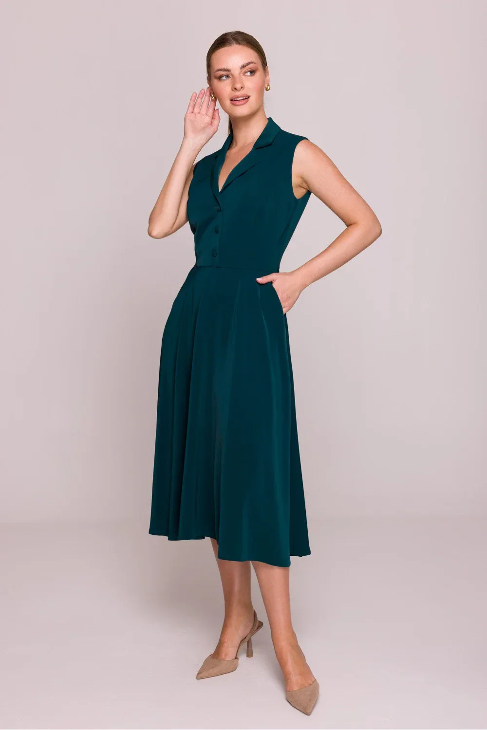 Objevte výjimečnou eleganci a ženský střih v této midi šatech, navržených a vyrobených s pečlivostí v Polsku. Je to ideální volba na speciální příležitosti, kombinující klasiku s moderností. Šaty jsou vyrobeny z hladké látky s jemným leskem, která se krásně přizpůsobuje postavě a přitahuje pozornost. Hluboký výstřih ve tvaru písmene V s klasickým límcem jí dodává rafinovaný charakter a smyslně zdůrazňuje krk. Bez rukávů je kreace lehká a ideální na teplé dny. Střih šatů je přiléhavý nahoře, což dokonale modeluje poprsí a pas, přecházející do rozkvetlého spodního dílu. Toto spojení vytváří tvar písku, zdůrazňující ženské tvary a zajišťující volnost pohybu. Midi délka, sahající za kolena, dodává eleganci a univerzálnost. Šaty se zapínají na skrytý zip na boku, co usnadňuje oblékání a dělá zapínání neviditelným. Navíc, horní část je zapínána vpředu, což zvyšuje pohodlí nošení. Funkční boční kapsy jsou diskrétním a zároveň praktickým prvkem. Chybějící podšívka zajišťuje lehkost a prodyšnost materiálu. Celá kolekce byla navržena a vyrobena v Polsku, co zaručuje vysokou kvalitu zpracování. Tyto šaty jsou skvělým návrhem na večerní vycházky, rodinné oslavy nebo elegantní večeře, kde chcete vypadat úchvatně a cítit se pohodlně.