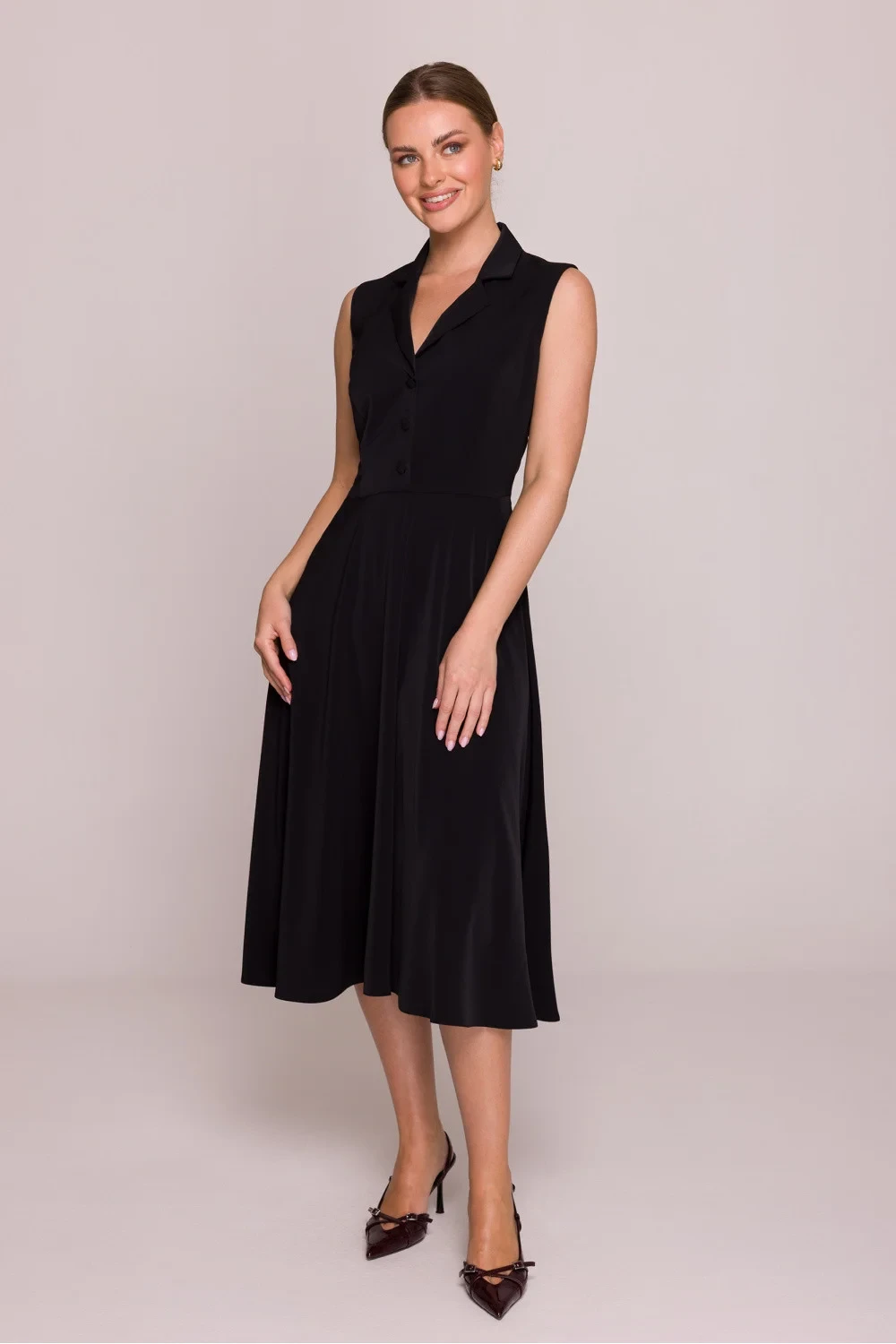 Objavte jedinečnou eleganci a ženský střih v této midi šatičce, navržené a ušité s důrazem na detaily v Polsku. Je to ideální volba na speciální příležitosti, kombinující klasiku s moderností. Šaty jsou vyrobeny z hladké látky s decentním leskem, která se krásně skládá na postavě a přitahuje pohled. Hluboký výstřih ve tvaru písmene V s klasickým límcem jí dodává rafinovaný charakter a smyslně zdůrazňuje krk. Bez rukávů je kreace lehká a ideální na teplé dny. Střih šatů je přizpůsobený nahoře, což dokonale modeluje poprsí a pas, přecházející do rozkvetlého spodku. Tato kombinace vytváří tvar písku, zdůrazňuje ženské tvary a zajišťuje volnost pohybu. Midi délka, sahající za kolena, dodává eleganci a univerzálnost. Šaty se zapínají na skrytý zip na boku, co usnadňuje oblékání a zajišťuje, že zapínání je neviditelné. Navíc, horní část je zapínána vpředu, což zvyšuje pohodlí nošení. Funkční boční kapsy jsou diskrétním a zároveň praktickým prvkem. Chybějící podšívka zajišťuje lehkost a prodyšnost materiálu. Celý kousek byl navržen a ušit v Polsku, co zaručuje vysokou kvalitu zpracování. Tyto šaty jsou skvělým návrhem na večerní vycházky, rodinné slavnosti nebo elegantní večeře, kde chcete vypadat ohromně a cítit se pohodlně.