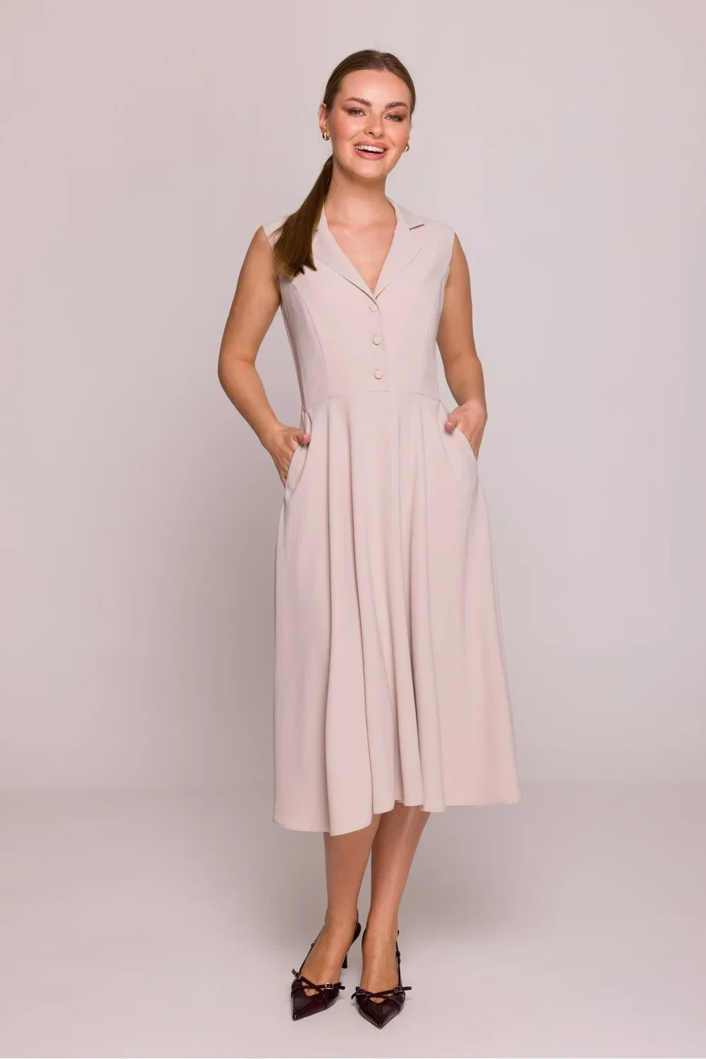 Objevte jedinečnou eleganci a ženský střih v této midi šatech, navržených a ušitých s důrazem na detaily v Polsku. Jedná se o ideální volbu na speciální příležitosti, spojující klasiku s moderností. Šaty jsou vyrobeny z hladké látky s decentním leskem, která se krásně přizpůsobuje postavě a přitahuje pohled. Hluboký výstřih ve tvaru písmene V s klasickým límcem jí dodává rafinovaný charakter a smyslně zdůrazňuje krk. Bez rukávů je šaty lehké a ideální na teplé dny. Střih šatů je přiléhavý nahoře, což dokonale modeluje poprsí a pas, přecházející do rozkvetlé spodní části. Toto spojení vytváří tvar písku, zdůrazňuje ženské tvary a poskytuje volnost pohybu. Midi délka, sahající za koleno, přidává eleganci a univerzálnost. Šaty se zapínají na skrytý zip na boku, co usnadňuje oblékání a zajišťuje, že zapínání není vidět. Navíc, horní část je zapínána na přední straně, což zvyšuje pohodlí nošení. Funkční boční kapsy jsou diskrétním a zároveň praktickým prvkem. Chybějící podšívka zajišťuje lehkost a prodyšnost materiálu. Celý kousek byl navržen a ušit v Polsku, co zaručuje vysokou kvalitu zpracování. Tyto šaty jsou skvělým návrhem na večerní výlety, rodinné oslavy nebo elegantní večeře, kde chcete vypadat ohromně a cítit se pohodlně.