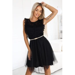 Tato jedinečná černá šaty spojující romantickou krajkou a lehký tyl vytváří ženský a jemný vzhled pro každou příležitost. Přizpůsobený vrchní díl s ozdobnou krajkou krásně zdůrazňuje ramena, zatímco rozšířený tyl dolní části dodává lehkost a eleganci. Celkový vzhled doplňuje tenký světlý pás s ozdobným prvkem, který zdůrazňuje pas a dodává jemnost outfitu. Jedná se o ideální šaty na rodinné oslavy, rande, večírek nebo jako výjimečný model na každý den, elegantní a zároveň pohodlný. Značka: Numoco Basic.