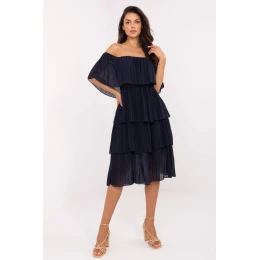Lehké a ženské šaty ideální na teplé letní dny. Střih ve tvaru roztřepeného květu krásně zdůrazňuje postavu a gumový pásek v pasu zajistí pohodlné nošení a přizpůsobení se postavě. Šaty sahají za kolena, nemají rukávy a jejich efektní výstřih typu španělské ramínko jemně odhaluje ramena, dodávajíc lehkost a romantiku. Model vyrobený z kombinace polyesteru a viskózy, s hladkým vzorem a dodatečnou podšívkou, díky čemuž dobře sedí a neprosvítá. Celou plochu šatů zdobí volány, které jim dodávají výjimečný charakter. Šaty nemají zapínání, oblékají se přes hlavu. Hodí se jak na každý den, tak i na více formální příležitosti, ideální na letní procházky, setkání s přáteli nebo rodinné oslavy.