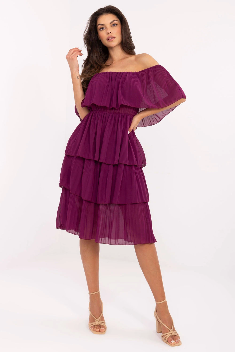 Lehké a ženské šaty ideální na teplé letní dny. Střih ve tvaru pláště krásně zdůrazňuje postavu a gumový pás zajišťuje pohodlí a přizpůsobení se postavě. Šaty sahají za kolena, nemají rukávy a jejich efektní výstřih typu hispanka jemně odhaluje ramena, dodávajíc lehkost a romantiku. Model je vyroben z kombinace polyesteru a viskózy, s hladkým vzorem a dodatečnou podšívkou, díky čemuž se dobře drží a neprosvítá. Celou plochu šatů zdobí volány, které jí dodávají výjimečný charakter. Šaty nemají zapínání, nasazují se přes hlavu. Hodí se jak na den, tak i na více slavnostní příležitosti, ideální na letní procházky, setkání s přáteli nebo rodinné oslavy.