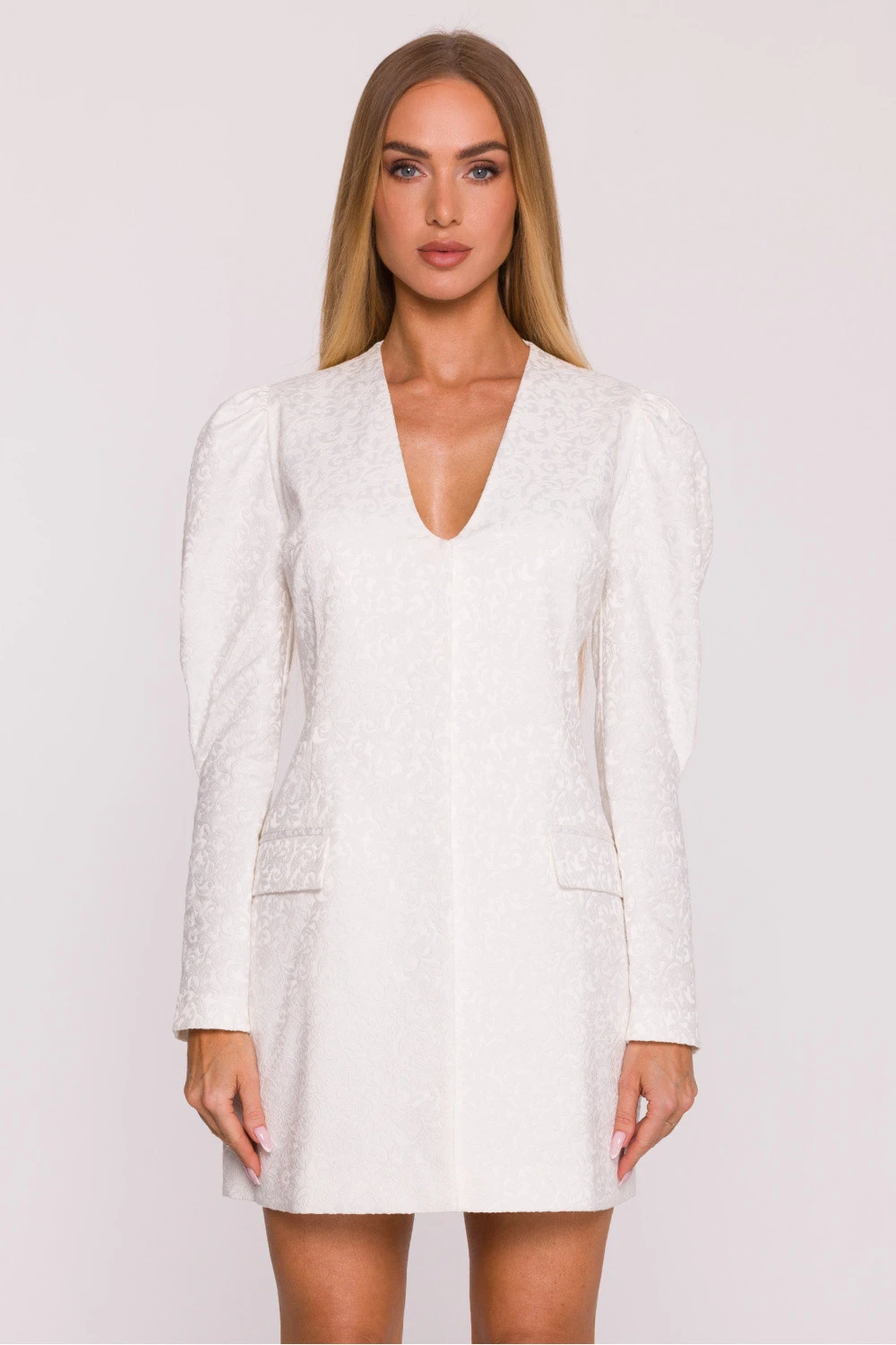 Elegantní šaty z žakárové látky s lehce vyvýšeným rostlinným vzorem jsou návrhem, který spojuje klasiku s jemnou dávkou modernosti. Pečlivě vybraný materiál dodává celku ušlechtilý charakter a podšívka po celé délce zajišťuje pohodlí nošení a perfektní padnutí střihu. Model má hluboký výstřih ve tvaru písmene V, který krásně zjemňuje postavu a přidává ženskost. Dlouhé rukávy s jemným nafouknutím nahoře dodávají eleganci a lehkost. Zapínání vpředu, skryté pod záhybem s knoflíky, zdůrazňuje rafinovaný charakter šatů. Celkový dojem doplňují imitace kapes s ozdobnými klopnami, které přidávají celku elegantní akcent. Střih přiléhavý, lehce talírovaný, jemně zdůrazňuje postavu, spojuje výrazně zvýrazněný vrchní díl s přímým spodkem. Mini délka dodává kreaci moderního výrazu, dělá z ní skvělou volbu jak na večerní výlety, tak na elegantní setkání. Navrženo a ušito v Polsku, vytvořeno s ohledem na ženy, které oceňují kvalitu, styl a nadčasovou eleganci.