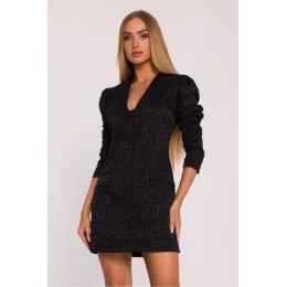 Elegantní šaty z žakárové látky s lehce vyvýšeným rostlinným vzorem jsou návrh, který spojuje klasiku s jemným nádechem modernosti. Pečlivě vybraný materiál dodává celku šlechetný charakter a podšívka po celé délce zajišťuje pohodlí nošení a perfektní uspořádání střihu. Model má hluboký výstřih ve tvaru písmene V, který krásně zúží siluetu a dodá ženskost. Dlouhé rukávy s jemným nafouknutím nahoře dodávají eleganci a lehkost. Zapínání na přední straně, skryté pod plisovaným lemem s knoflíky, zdůrazňuje rafinovaný charakter šatů. Celkový vzhled doplňují napodobeniny kapes s ozdobnými klopy, které celku přidávají elegantní nádech. Střih přiléhavý, lehce talířovaný, jemně zdůrazňuje siluetu, spojuje výrazně zvýrazněný vršek s přímým dnem. Mini délka dodává kreaci moderní výraz, dělající z ní skvělou volbu jak na večerní vycházky, tak na elegantní setkání. Navrženo a ušito v Polsku, vytvořeno pro ženy, které oceňují kvalitu, styl a nadčasovou eleganci.