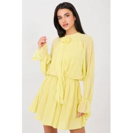 Tato rozklosaná koktejlová šaty jsou nabídkou pro ženy, které rády vypadají elegantně a s noblesou. Vyrobené z vysoké kvality směsi polyesteru, viskózy a elastanu, krásně padnou na postavě a zároveň zajistí pohodlí při nošení. Guma v pasu zdůrazňuje pas a zaručuje perfektní přizpůsobení. Model s mini délkou a dlouhými rukávy okouzlí jemnými detaily, volány u rukávů přidávají lehkosti a ozdobný volán s růží vpředu přitahuje pozornost a zdůrazňuje výjimečný charakter šatů. Kulatý výstřih dodává celku eleganci a hladký vzor zajišťuje, že kreace vypadá elegantně a nadčasově. Šaty nemají zapínání, což je dělá mimořádně pohodlnými při oblékání. Podšívka zajišťuje komfort a dokonalé urovnání materiálu. To je ideální volba na večírek, oslavu nebo silvestra, dodá ti šarm a sebevědomí v každé situaci.