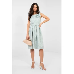 Elegantní návštěvní šaty vytvořené s ohledem na výjimečné příležitosti a stylové večírky. Rozkročený střih krásně zdůrazňuje pas a dodává siluetě lehkost, zatímco délka nad koleno přidává třídu a nadčasovou eleganci. Model vyrobený z vysoce kvalitní směsi polyesteru a viskózy, která zajišťuje pohodlí nošení a skvělé padání látky. Různorodá struktura látky dodává celku originální charakter a jemnou hloubku. Šaty bez rukávů s klasickým kulatým výstřihem vypadají mimořádně elegantně. S pasem, s ozdobnými řasami, krásně modelují postavu a zdůrazňují ženské tvary. Součástí je zapínací pásek, který dále zdůrazňuje pas, a odnímatelná brož ve tvaru květu, umožňující přizpůsobit outfit příležitosti. To je skvělá volba na večírky, rodinné oslavy a elegantní setkání, kdy chcete vypadat výjimečně a s elegancí.
