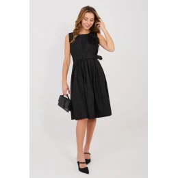 Elegantní návštěvní šaty navržené s ohledem na výjimečné příležitosti a stylové večírky. Rozkročený střih krásně zdůrazňuje pas a dodává postavě lehkost, zatímco délka nad kolena přidává třídu a nadčasovou eleganci. Model vyrobený z vysoce kvalitní směsi polyesteru a viskózy, která zajišťuje pohodlí nošení a skvělé uspořádání látky. Různorodá struktura látky dodává celku originální charakter a jemnou hloubku. Šaty bez rukávů s klasickým kulatým výstřihem vypadají mimořádně elegantně. Pasové střižení s ozdobnými záhyby krásně modeluje postavu a zdůrazňuje ženské tvary. Součástí je zapínací opasek, který dále zdůrazňuje pas, a odpínatelná brož ve tvaru květu, umožňující přizpůsobit stylizaci události. Jedná se o skvělou volbu pro oslavy, rodinné slavnosti a elegantní setkání, kdy chcete vypadat výjimečně a elegantně.