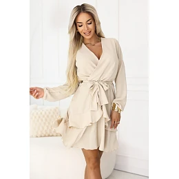 Představte si východisko, kdy chcete vypadat žensky a cítit se pohodlně. Tato béžová wrap sukni je ideální na setkání, večeři nebo důležitý výstup, kdy je důležitý jistý, klasický efekt. Jedná se o model, který snadno zkombinujete s lodičkami nebo kotníčkovými botami, vytvářející outfit na svatbu, křtiny nebo rande. Sukně má wrap výstřih na srdíčko a dlouhé rukávy s jemným lemem. V pasu je stahovací šňůrka, která umožňuje přizpůsobit obvod a zdůraznit siluetu. Spodek je mini ve formě rozkvetlého střihu, zakončený vrstvenými volány, které dodávají lehkost. Polská výroba.