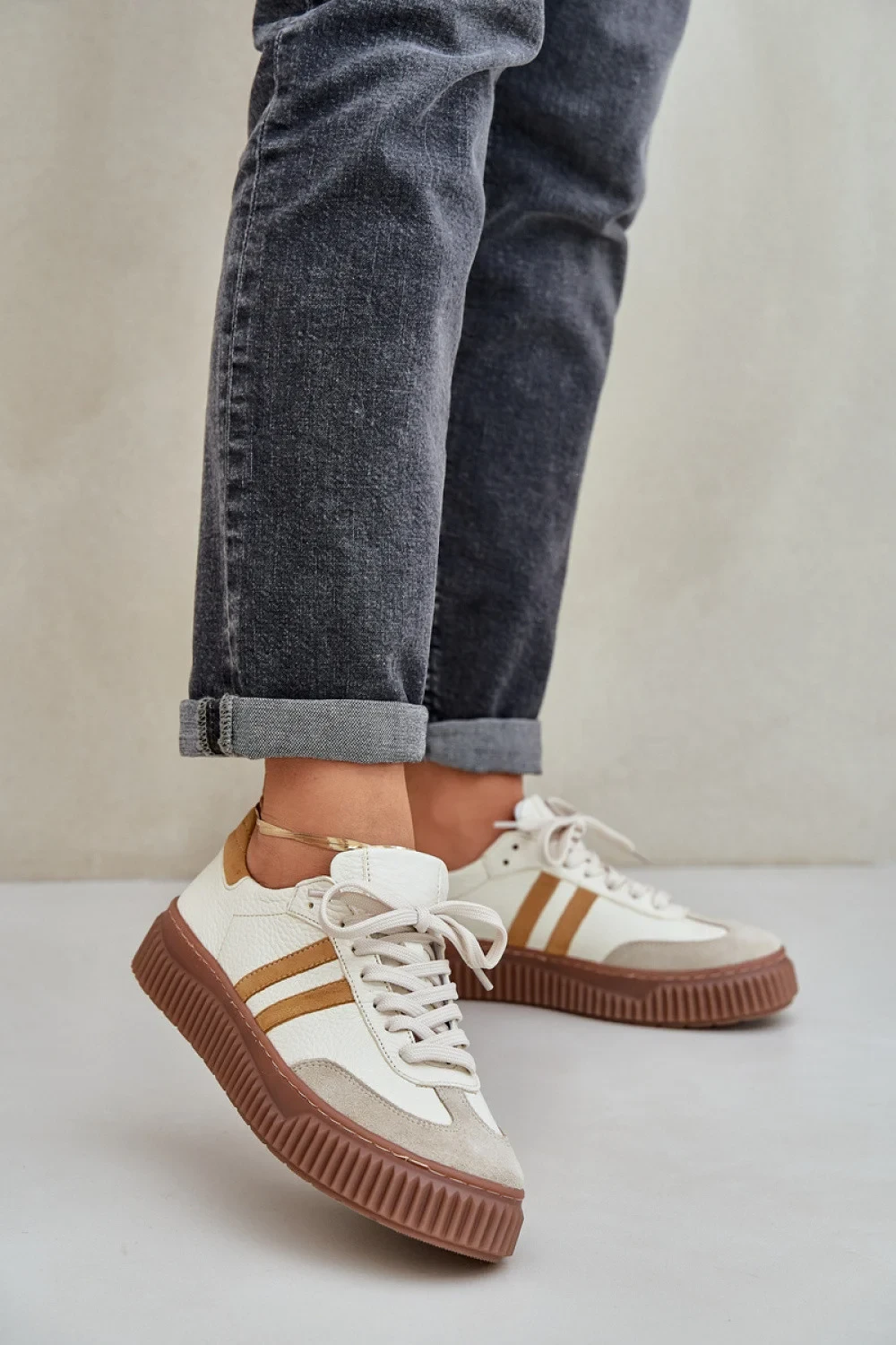 Moderní dámské tenisky vyrobené z přírodní kůže. Jsou ideální kombinací stylu a pohodlí. Nízké, šněrovací boty skvěle ladí jak k casualovým, tak elegantnějším stylizacím. Měkká vložka zajišťuje pohodlí po celý den. Ideální na procházky po městě, nákupy nebo setkání s přáteli, jsou módním a praktickým doplňkem každého šatníku.
