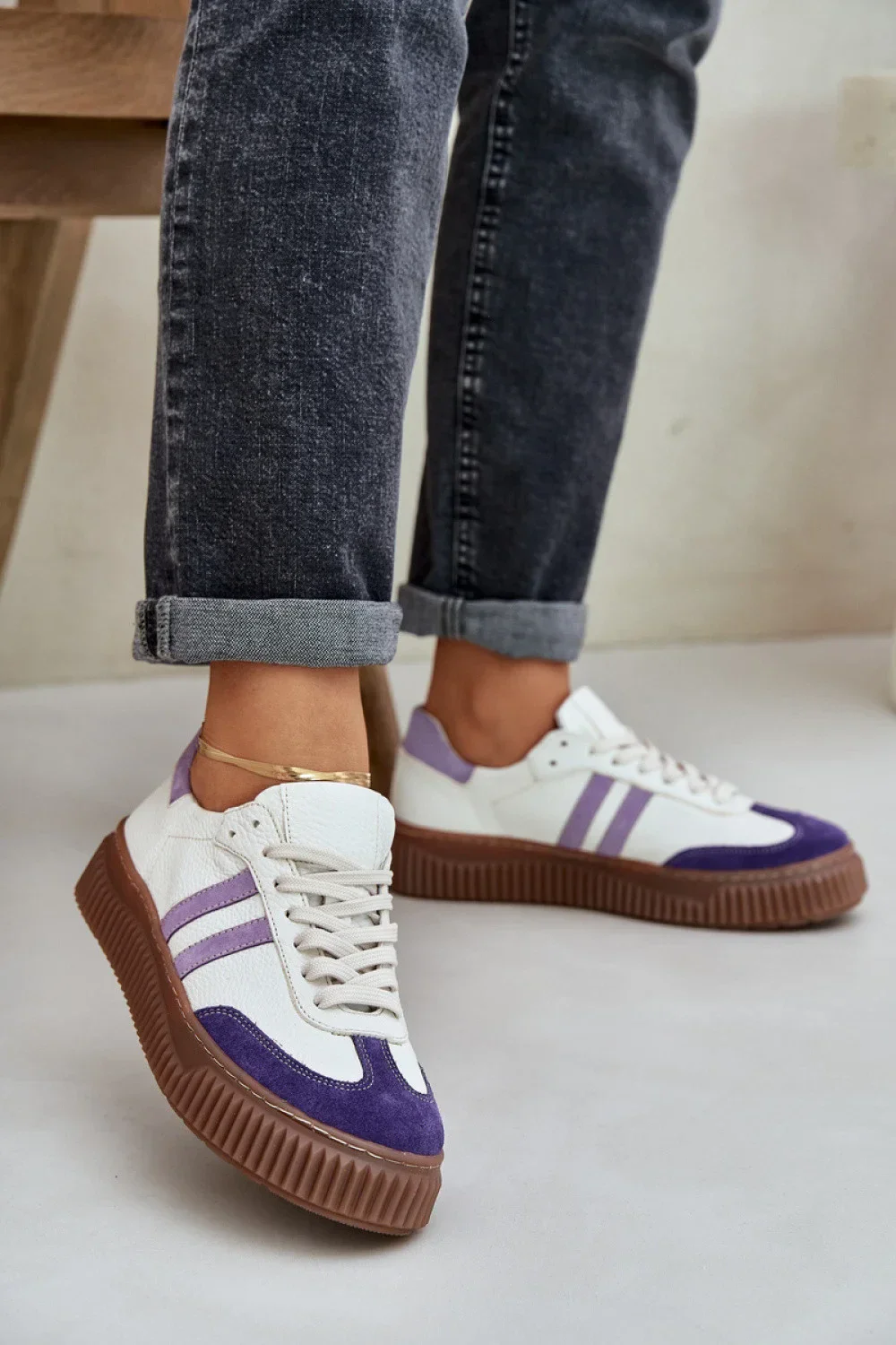 Moderní dámské tenisky vyrobené z přírodní kůže. Jsou to ideální spojení stylu a pohodlí. Nízké, šněrovací boty skvěle padnou jak k volnočasovým, tak k elegančtějším stylizacím. Měkká stélka zajistí pohodlí po celý den. Skvělé na procházky po městě, nákupy nebo setkání s přáteli, jsou módním a praktickým doplňkem každého šatníku.
