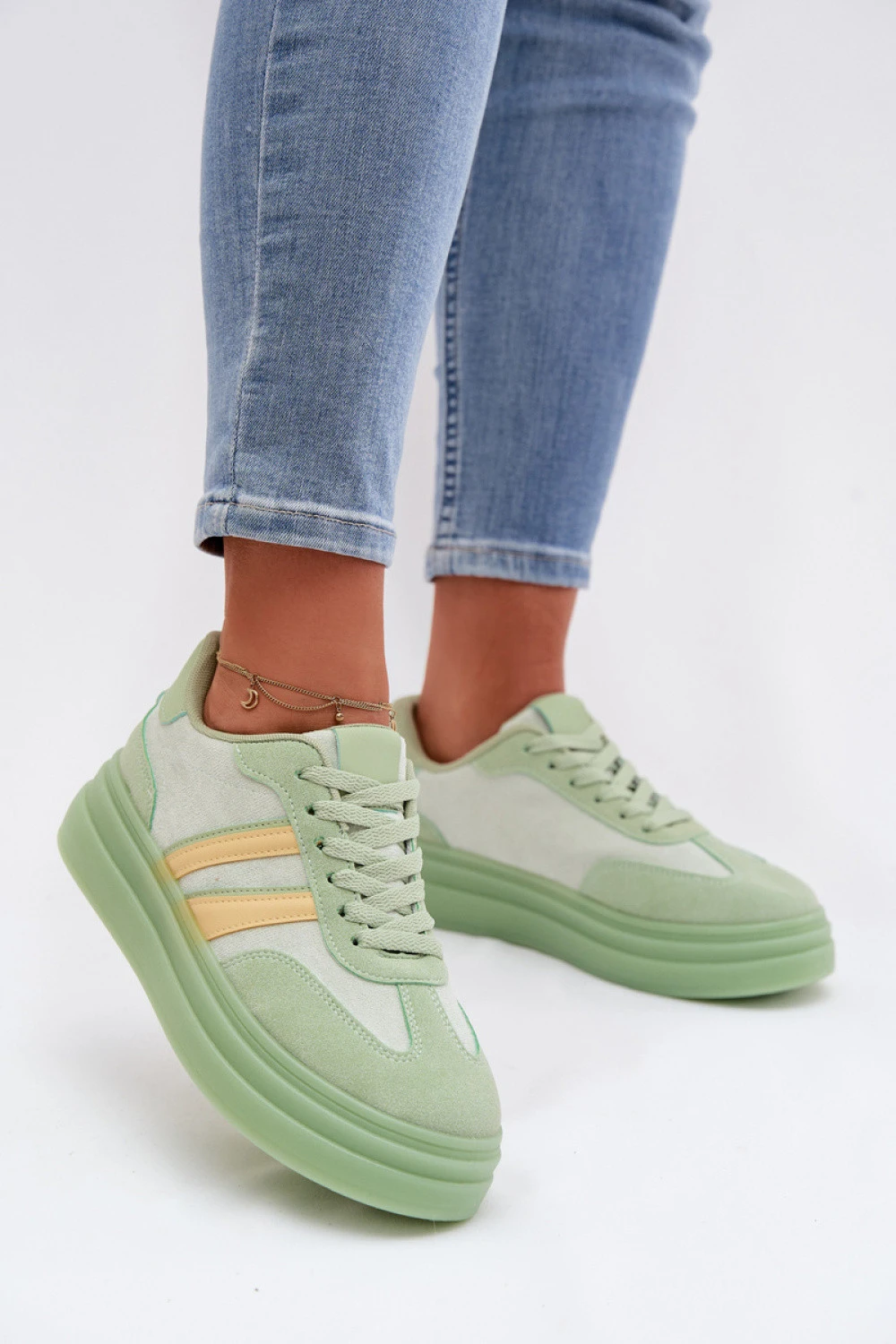 Stylové dámské tenisky z ekokože jsou pohodlnou volbou na každý den. Model osazený na platformě jemně zdůrazňuje postavu a poskytuje stabilitu během chůze. Dvě pásky umístěné po stranách dodávají sportovní, moderní charakter. Měkká pěnová vložka zaručuje pohodlí po celý den, díky čemuž se tenisky skvěle hodí do každodenních stylizací.