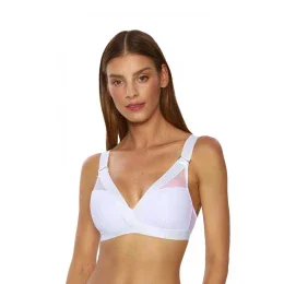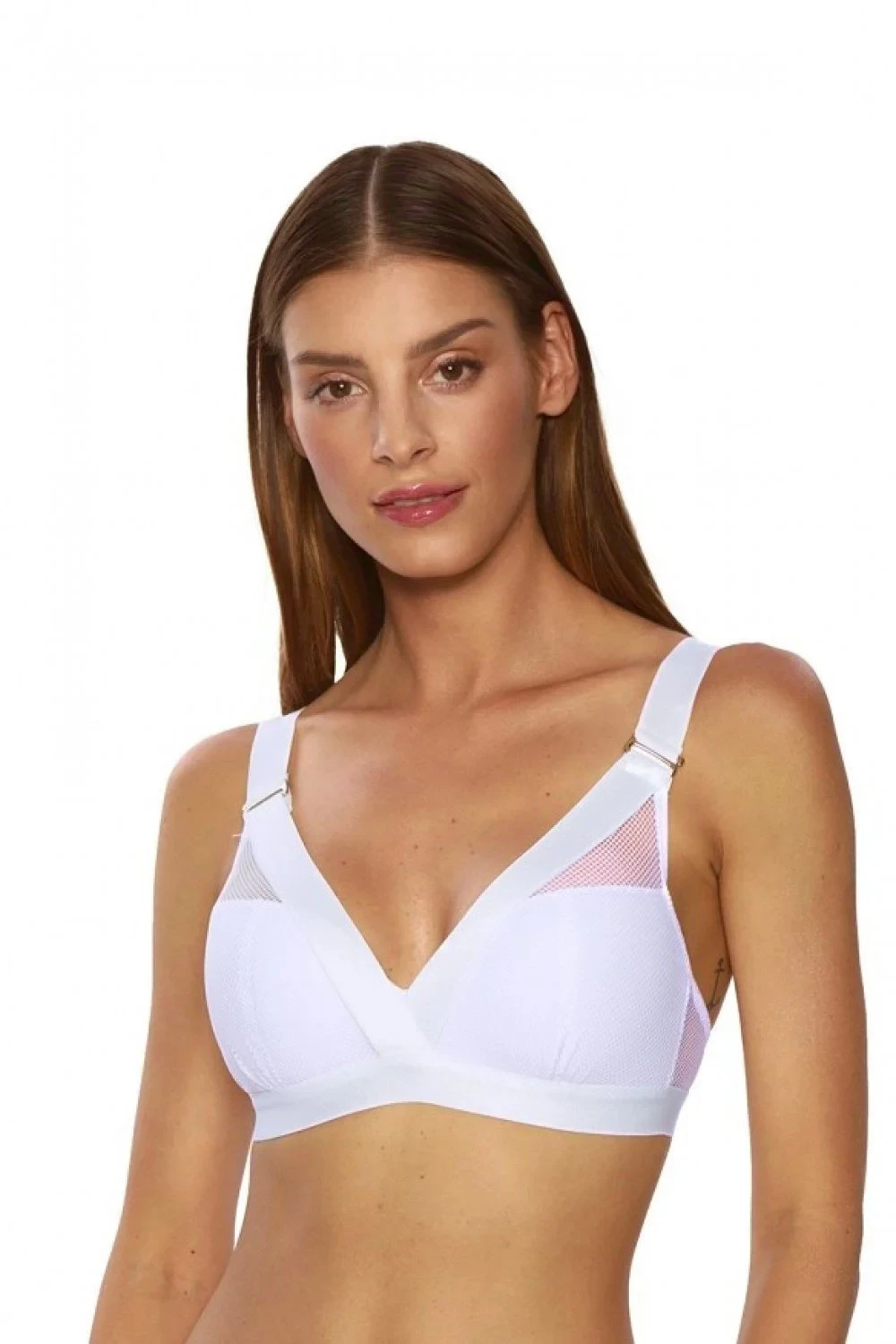 Sportovní podprsenka 748 Lara white KINGA - bílá barva - měkké košíčky ze síťoviny - podšité pěnou - spodní lem, výstřih a ramínka z široké elastické gumy - nadnáší poprsí a poskytuje mu oporu i při intenzivní fyzické námaze a aktivitě - nastavitelná ramínka se čtyřstupňovým nastavením délky
