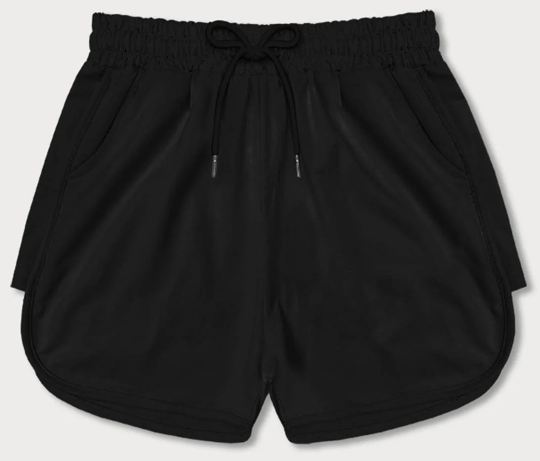 Šortky mají volné nohavice, dvě kapsy a středně vysoký střih a sed. V pase modelu je guma a šnůrka.