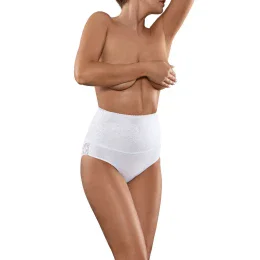 Dámské stahovací kalhotky 148 white plus BABELL - bílá barva - s vyšší linií pasu - stahují a tvarují bedra a bříško - zdobené jemnou krajkou s květinovým motivem - materiálové složení spodní části : 92% bavlna + 8% elastan