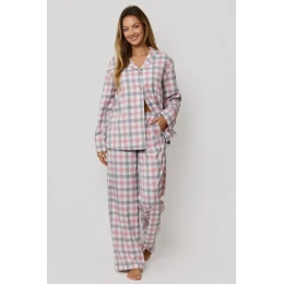 Górna część piżamy to bluza z długim rękawem, ozdobiona ponadczasowym kołnierzykiem i zapinana na guziki – praktyczne, stylowe rozwiązanie, które sprawdzi się zarówno w nocy, jak i podczas domowego relaksu. Wzór w kratkę nadaje całości szykownego charakteru. Długie spodnie wyposażono w wygodne kieszenie oraz elastyczną gumkę w tunelu, zapewniając pełną swobodę ruchów i idealne dopasowanie.
