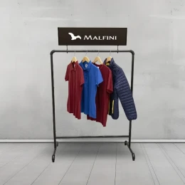 Praktický stojan pro prezentaci textilu MALFINI v obchodě, showroomu nebo na veletrhu. Stabilní, přenosný a elegantní.
