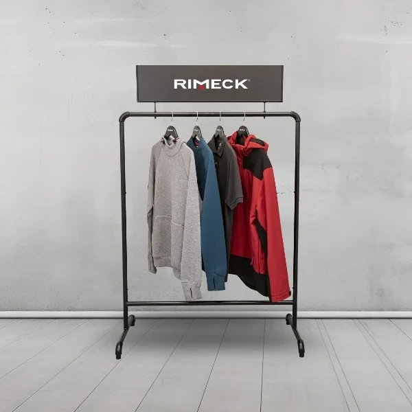 Praktický stojan pro prezentaci textilu RIMECK v obchodě, showroomu nebo na veletrhu. Stabilní, přenosný a elegantní.