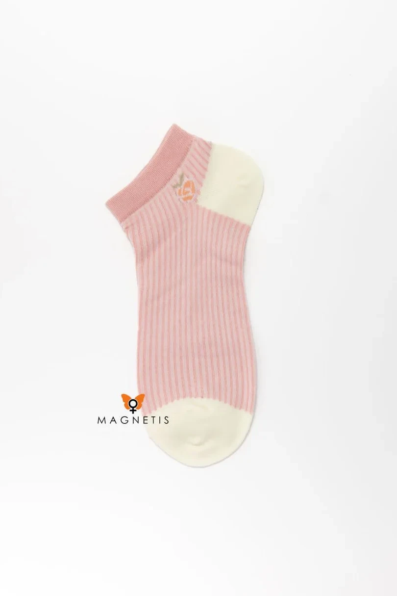 Ponožky Magnetis MX241158 05 jsou kombinací pohodlí, stylu a jemného designu. Jsou vyrobeny z měkké směsi polyesteru a bavlny, poskytují prodyšnost a pružnost a dokonale padnou. Pastelové proužky, kontrastní lemování špičky a paty a jemná výšivka jim dodávají jedinečný šarm. Jsou ideální pro každodenní stylizaci, dobře se hodí k teniskám, cvičkám i mokasínám.