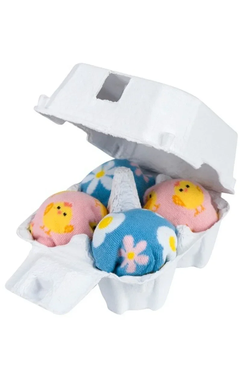 Veselé bavlněné nožičky balené ve výliscích na vajíčka, vyrobené z vysoce kvalitních surovin. Složení materiálu: 80 % bavlna, 15 % polyamid, 5 % elastan.