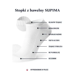 Stopki frotte SUPIMA z najwyższej jakości bawełny amerykańskiej. Włókna bawełny SUPIMA sprawiają, że ten rodzaj skarpet charakteryzuje się niezwykłą miękkością i wytrzymałością, są odporne na pilingowanie. Model do kostki z frottą w stopie, oraz EAN čárové kódy zboží jsou: 5907422061709, 5907422061709, 5907422061709, 5907422061709, 5907422061709, 5907422061709, 5907422061709, 5907422061709, 5907422061709, 5907422061709