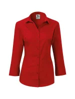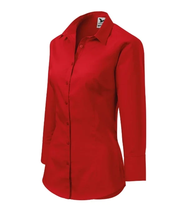 projmutý střih s bočními švy záševky na zadním dílu pasové a prsní záševky dvoudílný košilový límec přední kraje začištěny légou 3/4 rukávy s rovnou vysokou manžetou a rozparkem knoflíčky v barvě materiálu (1 náhradní navíc) tvarovaný dolní kraj
