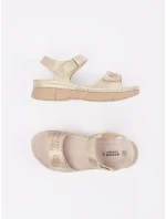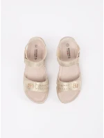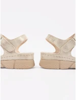 Dámské sandály vyrobené z eko semiše. Usazené na jemné platformě, poskytují pohodlí a stabilitu po celý den. Zapínají se na sponu s nastavitelným páskem, což umožňuje dokonalé přizpůsobení noze. Vpředu se nachází jemný zlatý detail, který spojuje pásky. Měkká stélka zajišťuje pohodlí při chůzi. Ideálně se hodí jak k šatům, tak k kalhotám, vytvářející stylový vzhled pro každou příležitost. Při výběru velikosti se řiďte tabulkou velikostí.