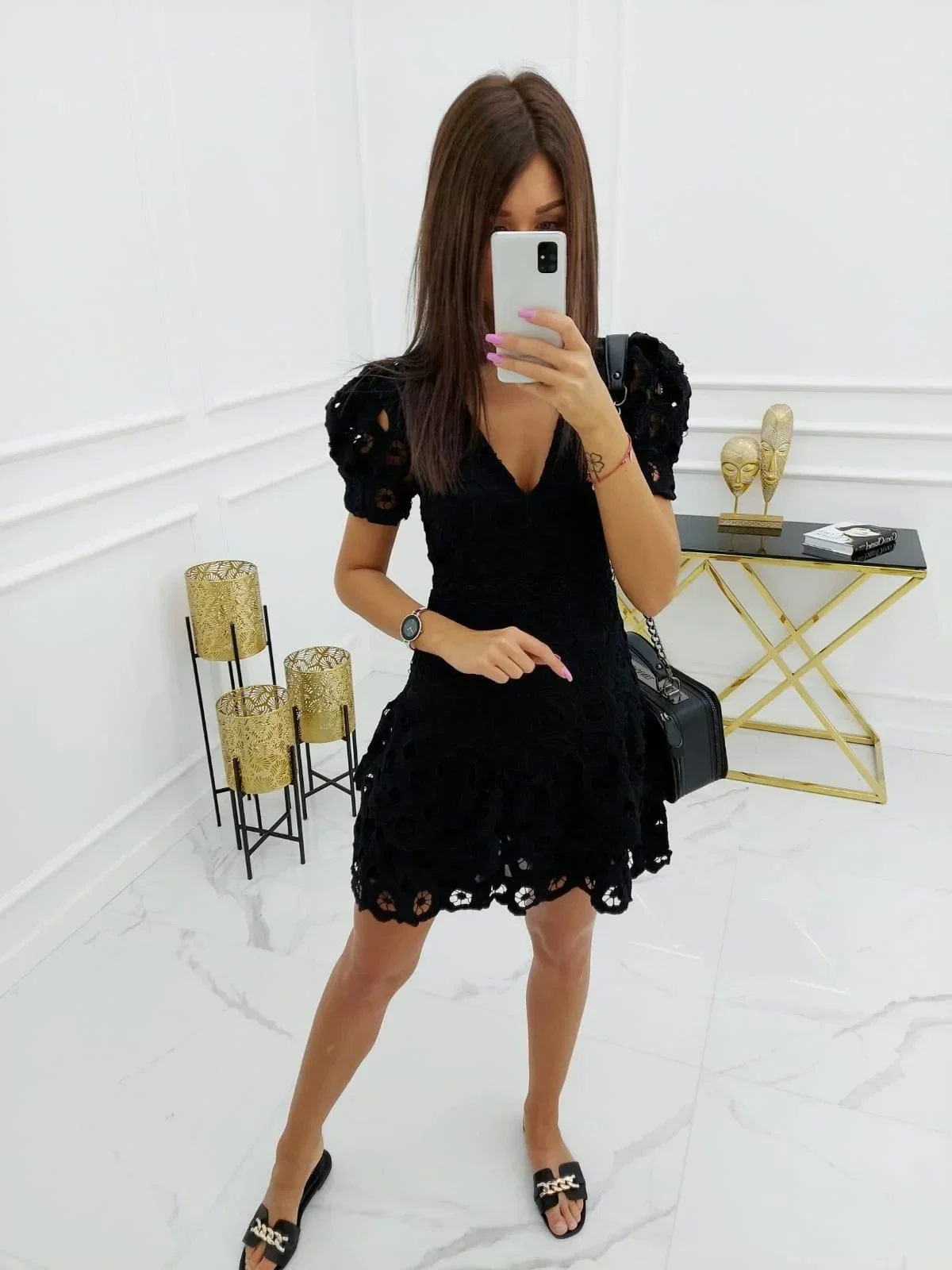 Působivé šaty, které krásně sedí na postavě, ve fenomenální černé barvě. Vyrobené z měkké gipirové látky, zapínání na zádech na skrytý zip (zip vede téměř po celé délce šatů - díky němu šaty velmi elegantně zvýrazňují linii těla). Výstřih do V, volné, s volánky, pohodlné. Rukávy ve tvaru malých bufetů. Perfektní návrh na jaro. 100% polyester.