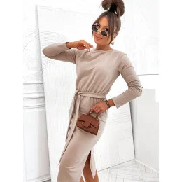 Šaty mají kulatý výstřih, dlouhé rukávy a v pase mají gumu. Model doplňuje pásek pro zavazování. Na boku šatů je rozparek.