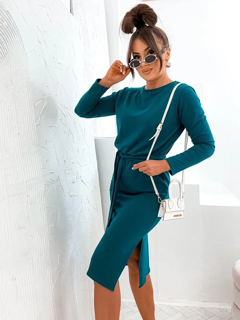 Šaty mají kulatý výstřih, dlouhé rukávy a v pase mají gumu. Model doplňuje pásek pro zavazování. Na boku šatů je rozparek.