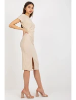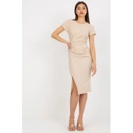 Přiléhavé šaty s krátkými rukávy a kulatým výstřihem. Ozdobné řasení v pase, dole rozparek.