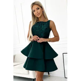 Šaty s výrazně rozšířenou sukní a elastickou krajkou. Zapínají se vzadu na krytý zip. Šaty v lahvově zelené barvě. Značka Numoco. Polský výrobek.