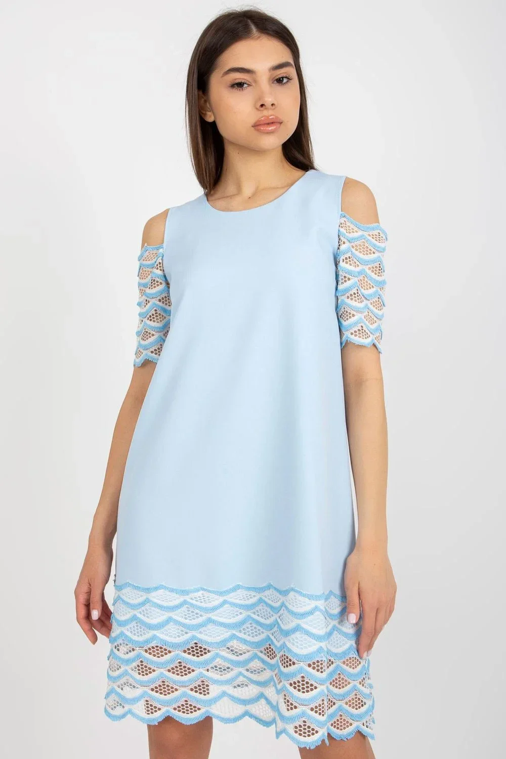 Koktejlové šaty s krátkými projmutými rukávy a kulatým výstřihem. Spodní část šatů je zdobená prolamovaným zdobením.