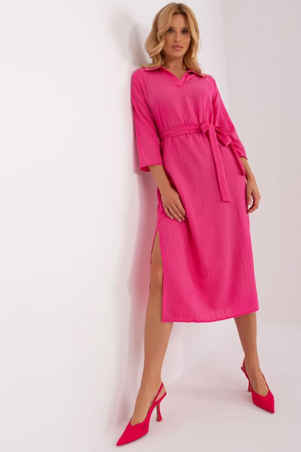 Šaty rovného střihu s 3/4 rukávy, zavazováním v pase a bočními rozparky. Návrh na každodenní nošení i mimo něj.