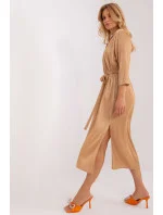 Šaty s 3/4 rukávy, límečkem a výstřihem do V. Zavazování v pase, dole rozparky. Šaty z žebrované tkaniny.
