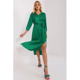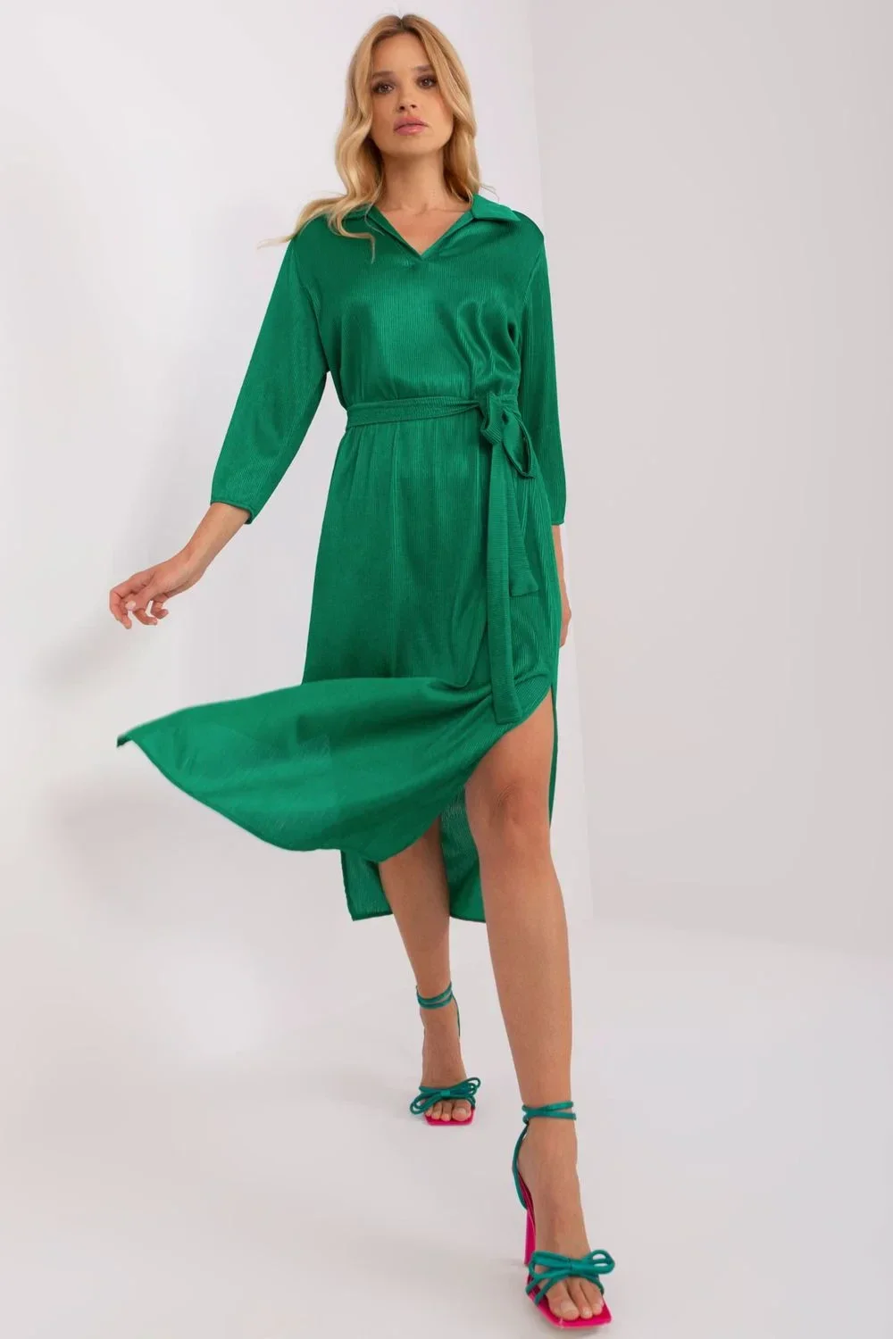 Šaty s 3/4 rukávy, límečkem a výstřihem do V. Zavazování v pase, dole rozparky. Šaty z žebrované tkaniny.