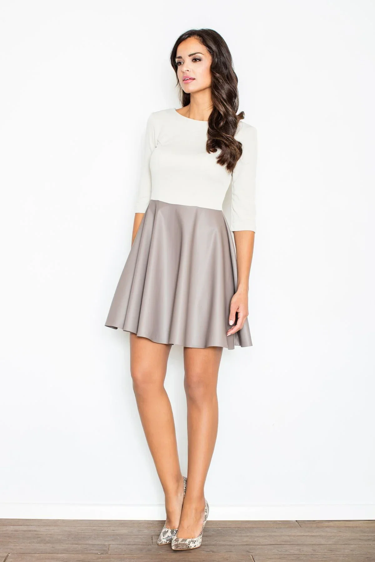 Dvoubarevné šaty, které vypadají jako sukně s halenkou. Nápadné a velmi pohodlné, mají skryté zapínání na zip na zádech, přiléhavý horní díl s decentním výstřihem a rozšířený spodní díl z látky připomínající kůži. 96 % polyester, 4 % elastan.