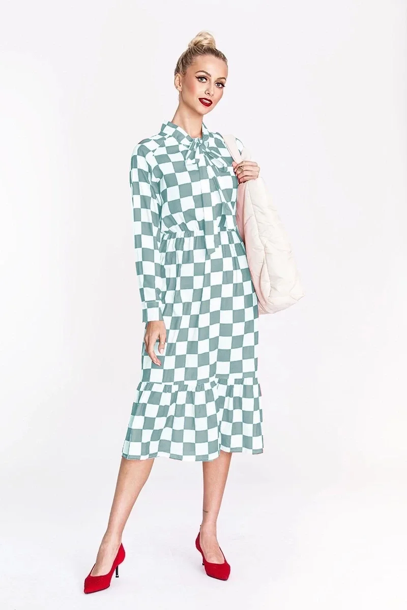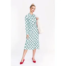 Šaty mají vázání ve výstřihu. Vrchní část šatů se zapíná knoflíčky. Model má dlouhé rukávy s manžetami a pod poprsím má gumičku. Rozšířenou spodní část modelu lemuje volánek. Šaty mají délku pod kolena.